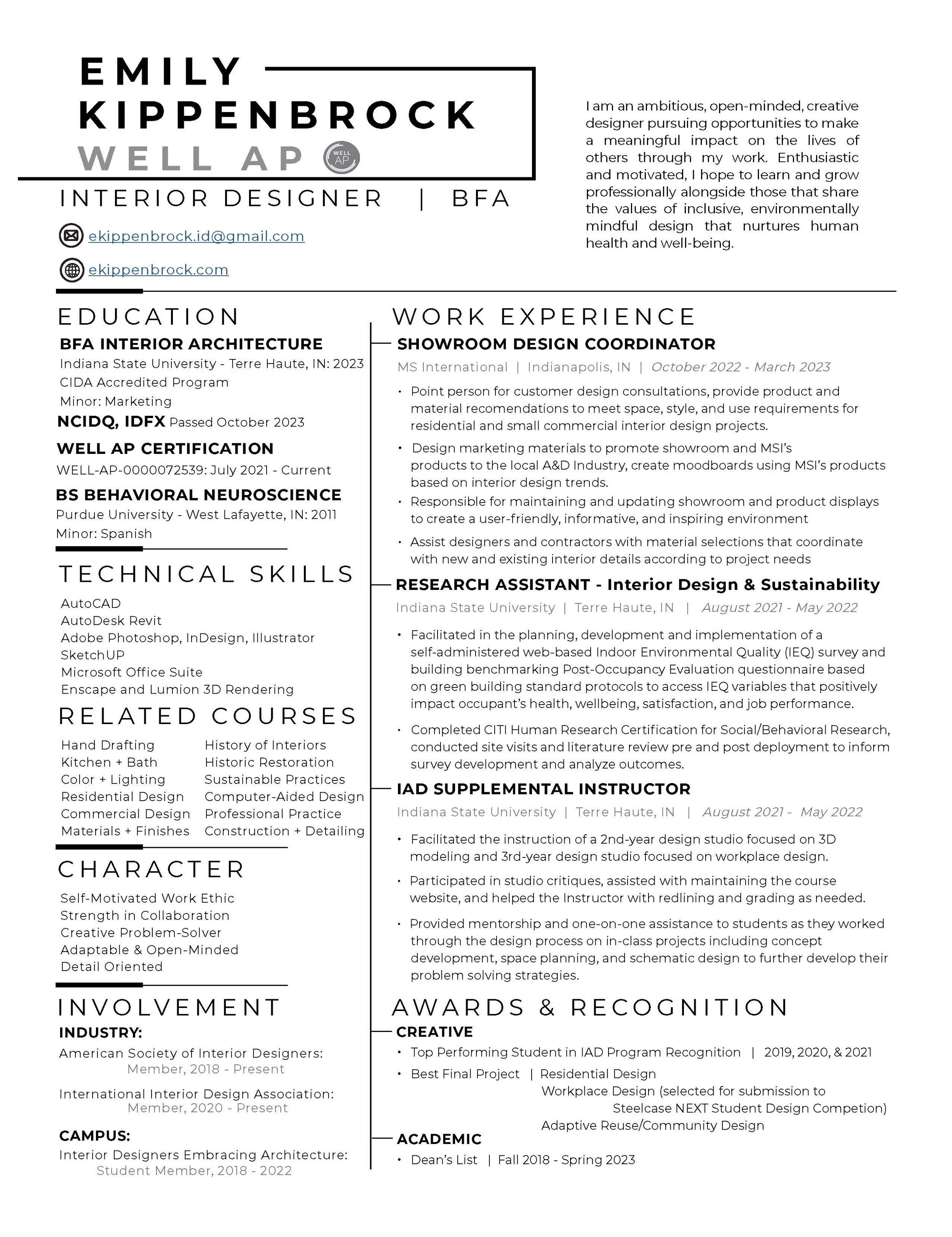 I am fascinated my new ideas and fresh ways to upgrade or enhance the status quo. My education and background in psychology and behavioral neuroscience allows me to examine client needs from that point of view to inform user-friendly environments and design solutions that meet the behavioral, psychological, and physical needs of current and future users. Health, Wellness and Sustainability are at the core of my design philosophy. I am a WELL AP and successfully passed the IDFX portion of the NCIDQ Exam. .
