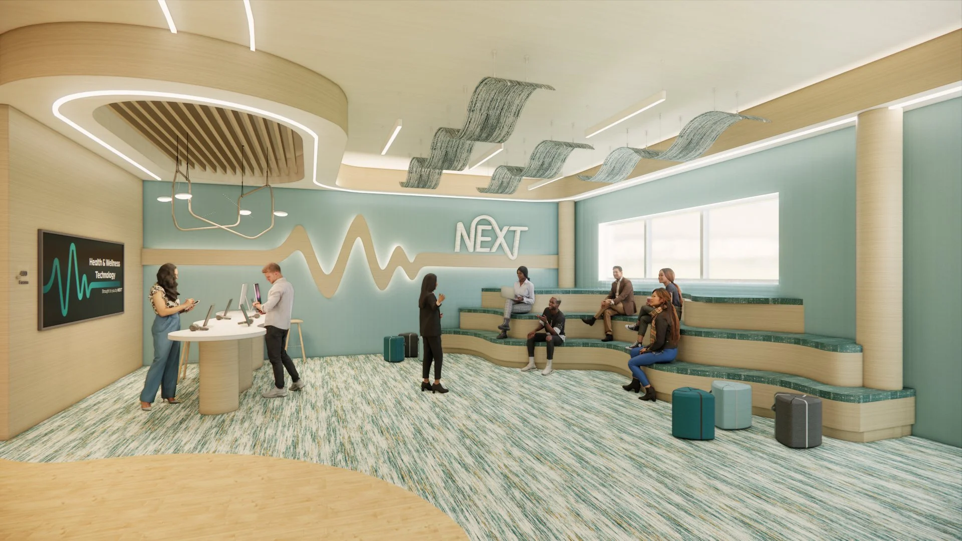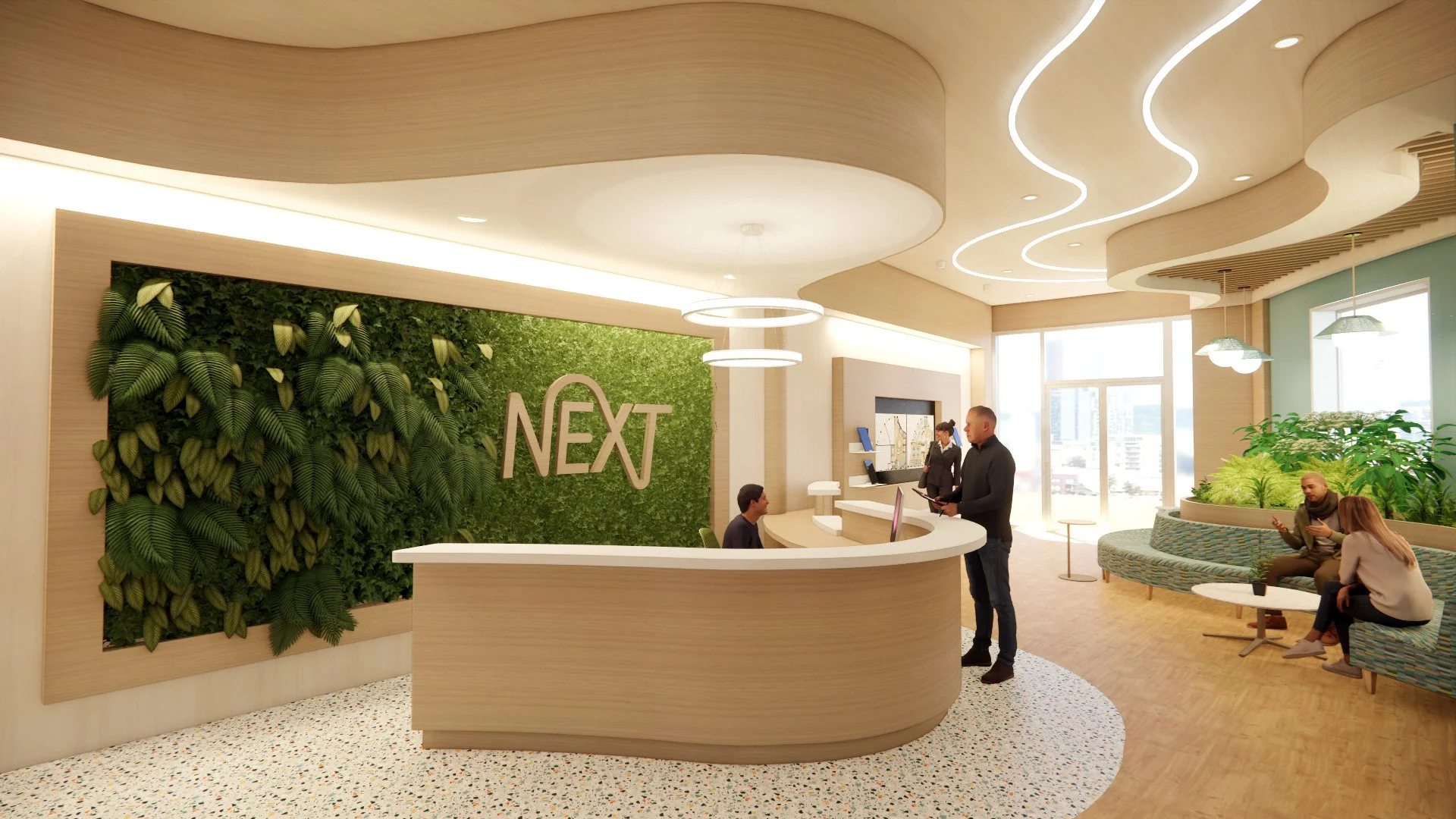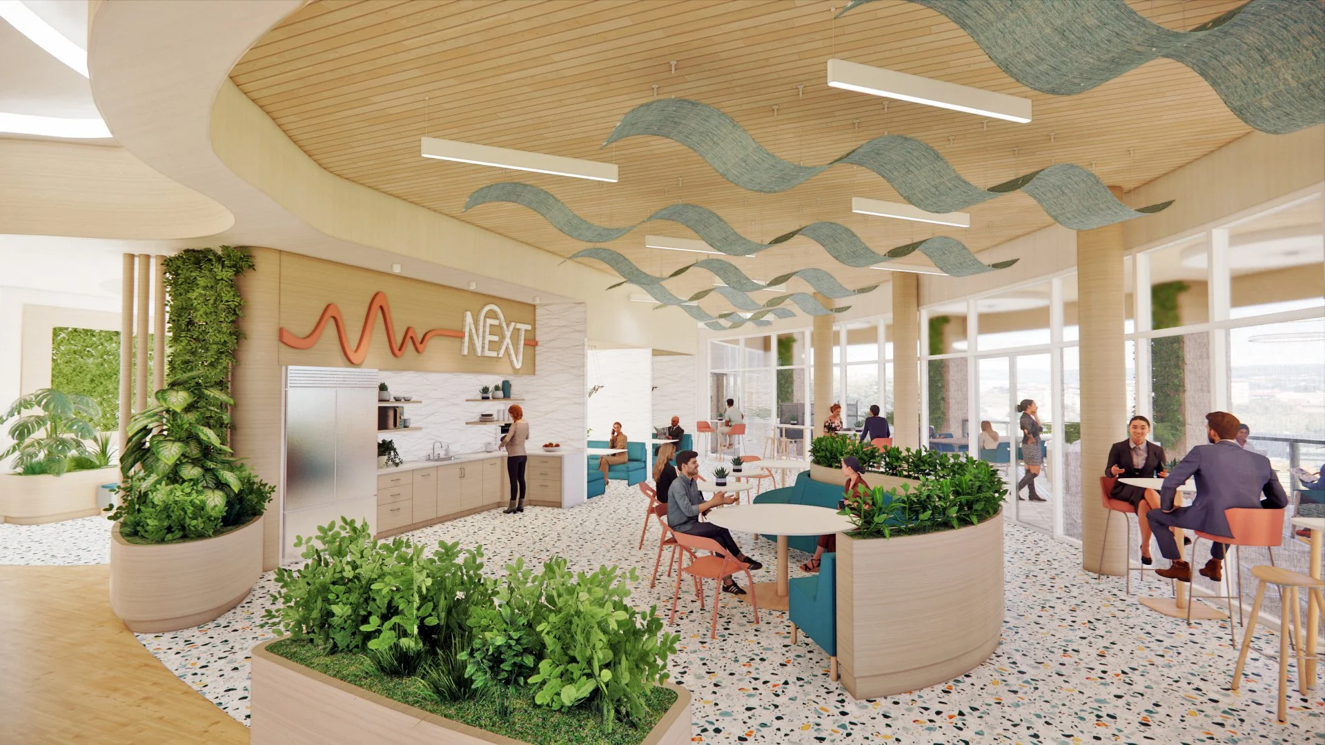 This new office space re-imagines how individuals interact through its creative and inspiring atmosphere with interior pocket gardens, wellness room, community forum, inspiration zone, and diffused lighting. Using natural textures, materials, and patterns creates a multi-sensory experience. Biophilic design elements are integrated to create a seamless synergy with nature and support user health and well-being. The space plan includes a range of workspaces and thoughtful furniture options to promote physical, mental, and emotional well-being. Lastly, post-pandemic social distancing spacing requirements were implemented to ensure NEXT employees can go back to work in a safe, health-focused environment.