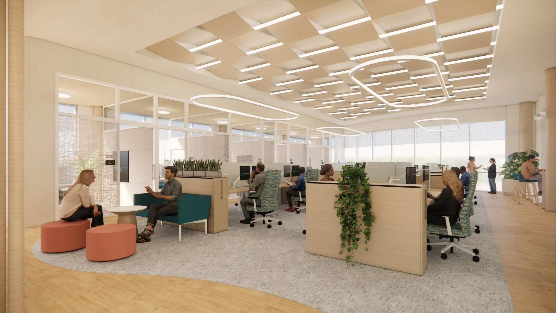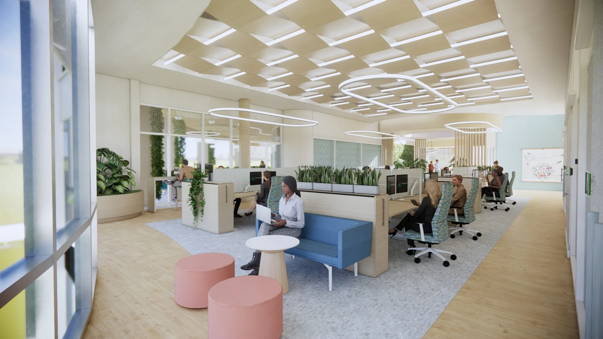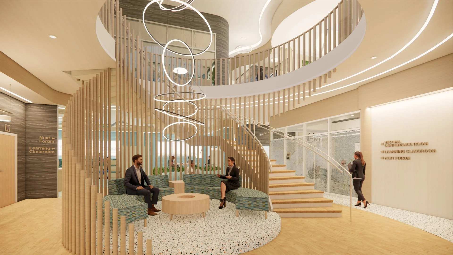 This new office space re-imagines how individuals interact through its creative and inspiring atmosphere with interior pocket gardens, wellness room, community forum, inspiration zone, and diffused lighting. Using natural textures, materials, and patterns creates a multi-sensory experience. Biophilic design elements are integrated to create a seamless synergy with nature and support user health and well-being. The space plan includes a range of workspaces and thoughtful furniture options to promote physical, mental, and emotional well-being. Lastly, post-pandemic social distancing spacing requirements were implemented to ensure NEXT employees can go back to work in a safe, health-focused environment.