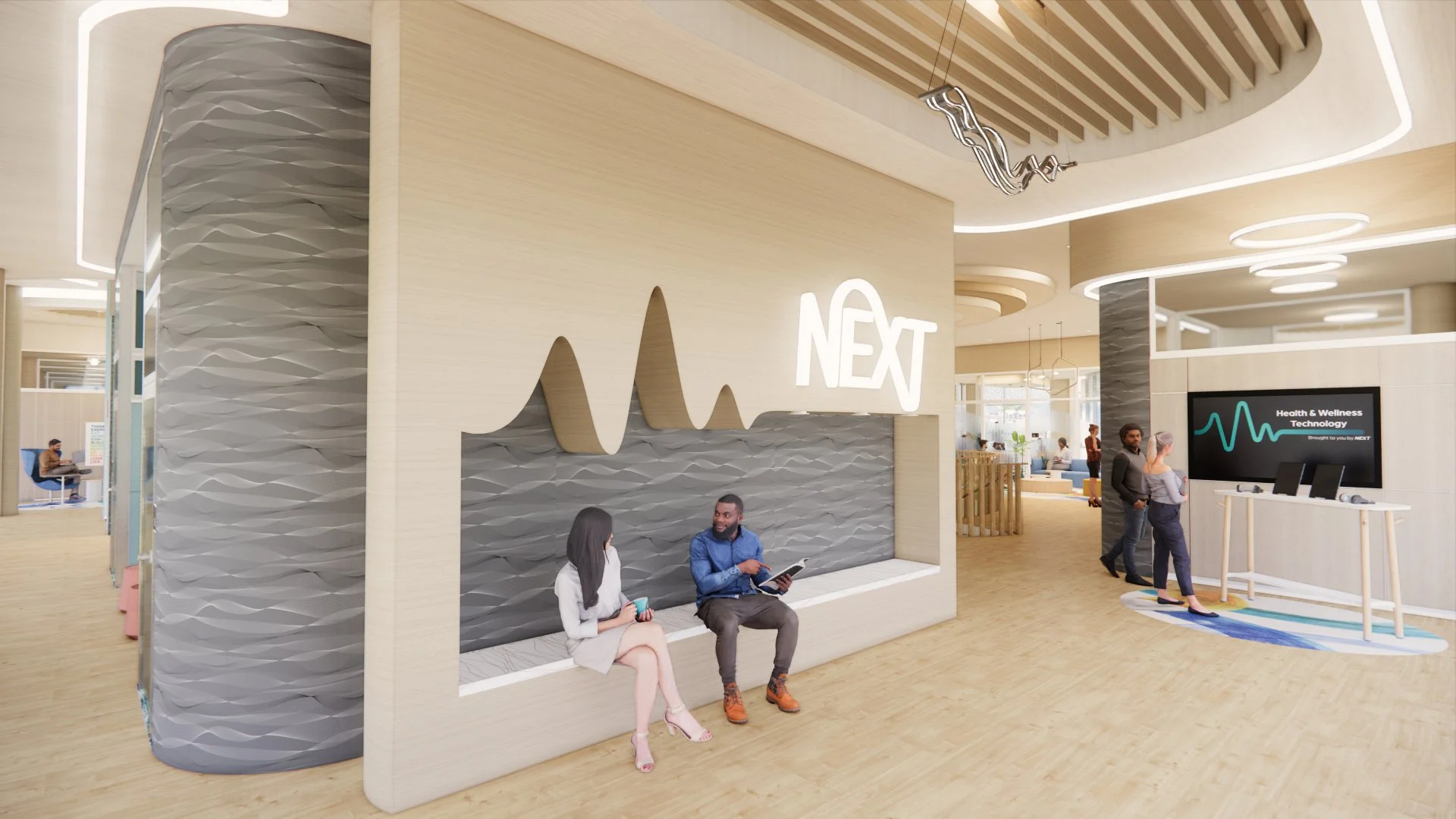 NEXT is a global technology company specializing in all aspects related to health and wellness to improve lives of people all over the world. To support its mission - space planning focused on promoting employee productivity and well-being. Research shows that when people work together, they are on the same wavelengths, which translates to creating a workspace that elevates NEXT employees’ individual experience and supports collaboration and team-based work modalities for this expanding global company. Since technology continues to transform how employees maintain connection with one another as well as with other offices, and Next wants to support its already robust work from home policies, the design incorporates a variety of virtual reality/communication zones.