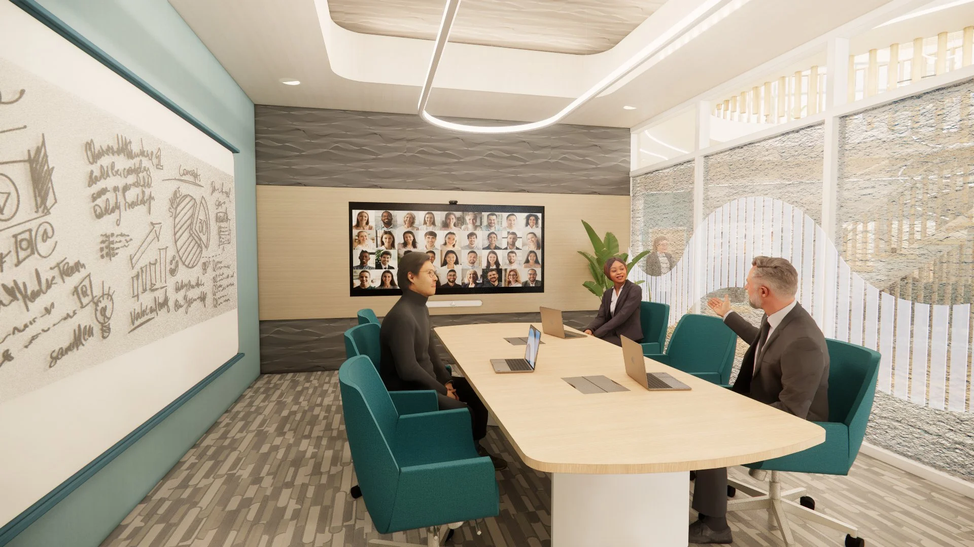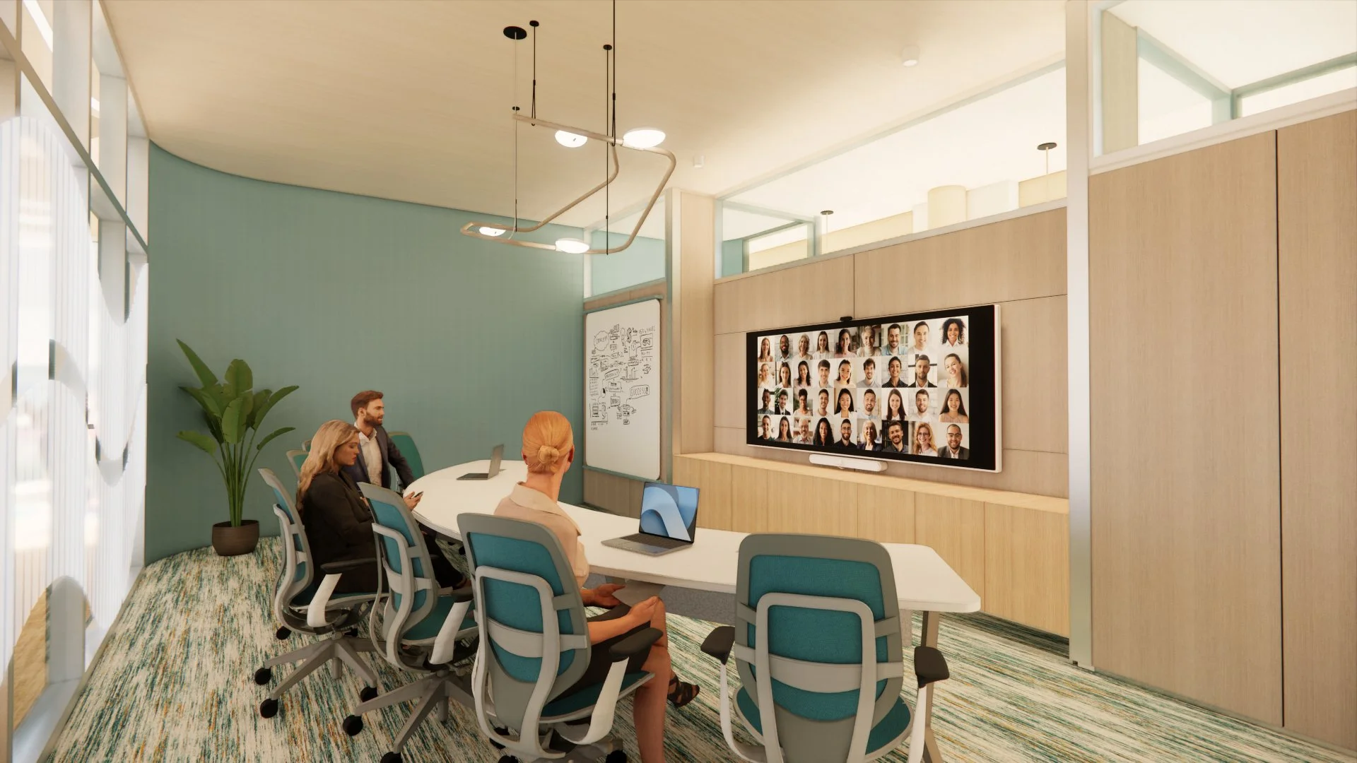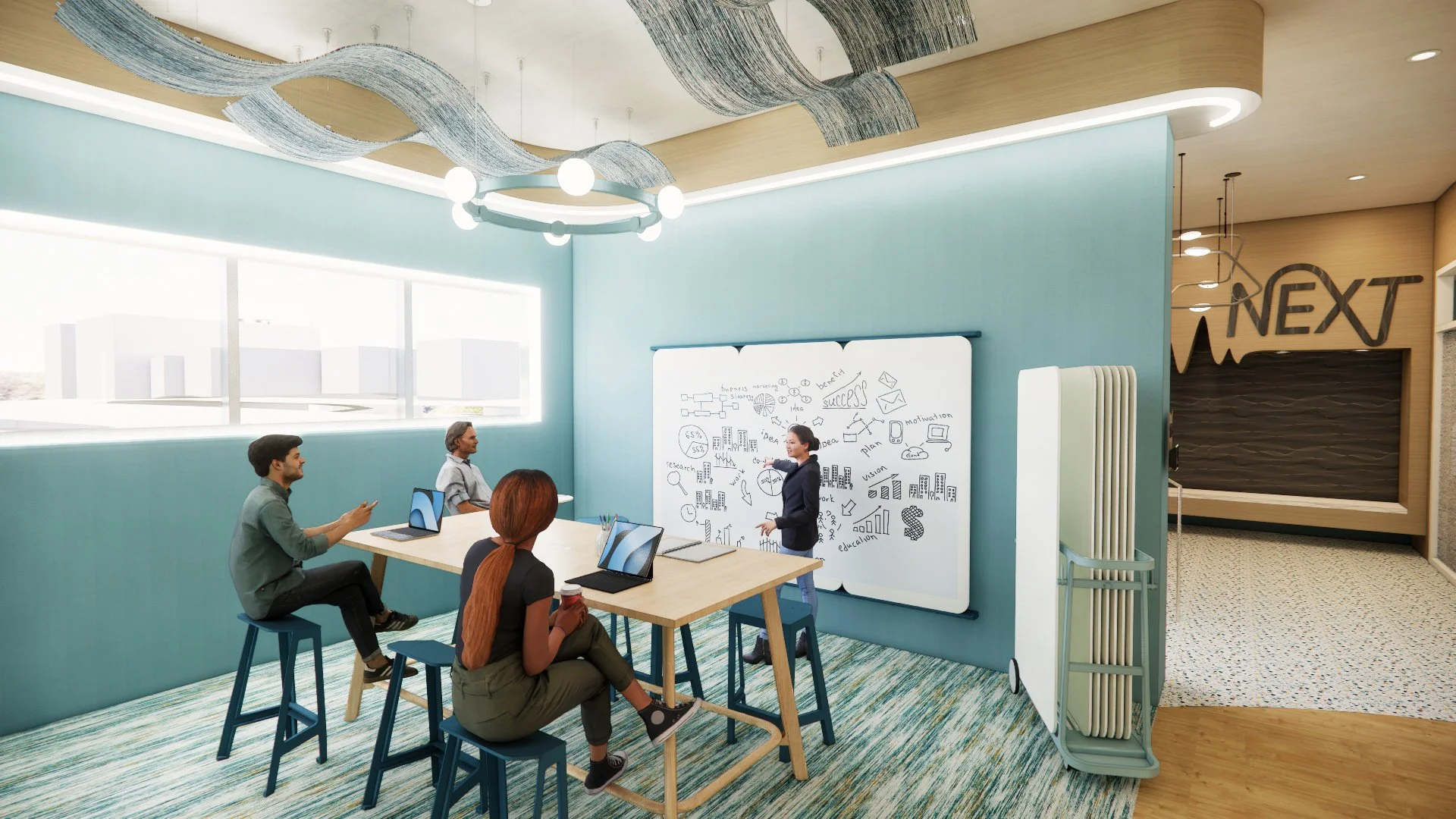 Use thoughtful technology integrations to address seamless connectivity between this satellite office, Next Headquarters, and employees working from home